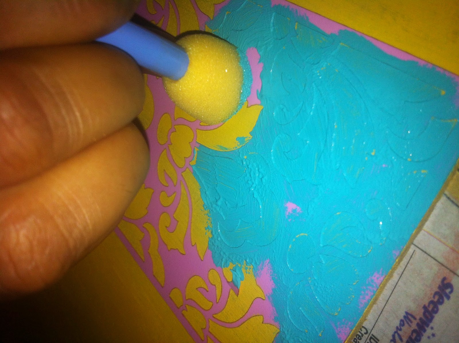 Once the background was done, I let it dry. the fun part now, stenciling! I used a foam brush to dab at the stencil. I learnt that keeping the paint think prevented the paint from getting blotchy.